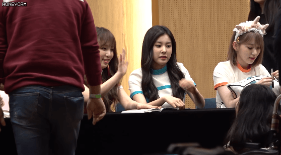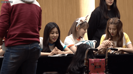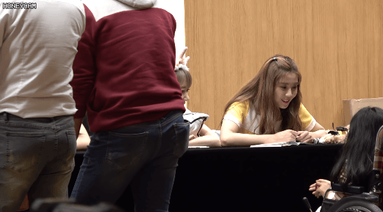 휠체어 타고 온 애기 팬과 눈 마주치며 얘기하는 멤버들.GIF